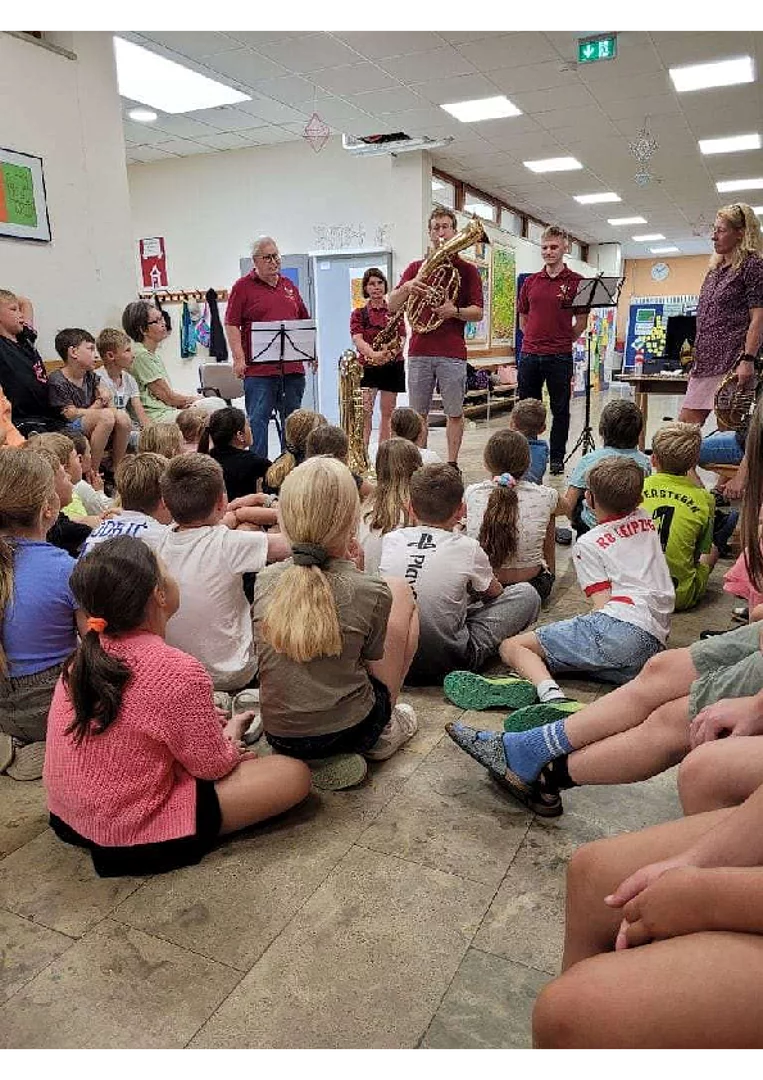 Am Freitag, 04.07.2025 besuchten 5 Musiker des Hummelgauer Jugendblasorchesters unsere Zweit- und Drittklässler in Glashütten und Mistelgau.