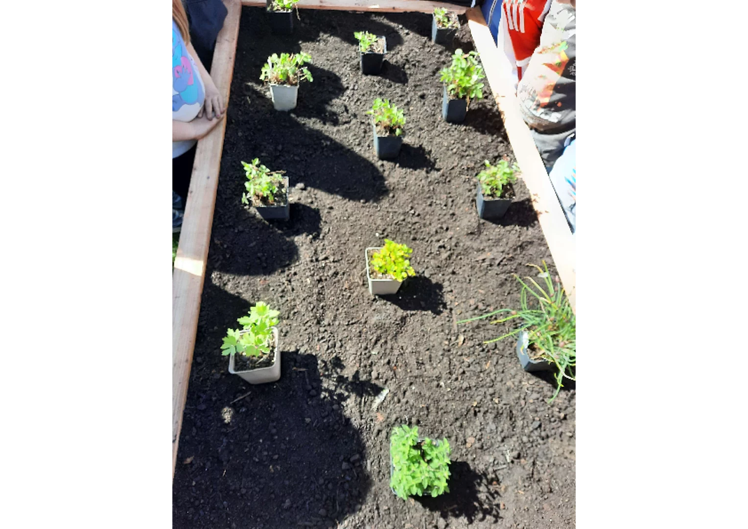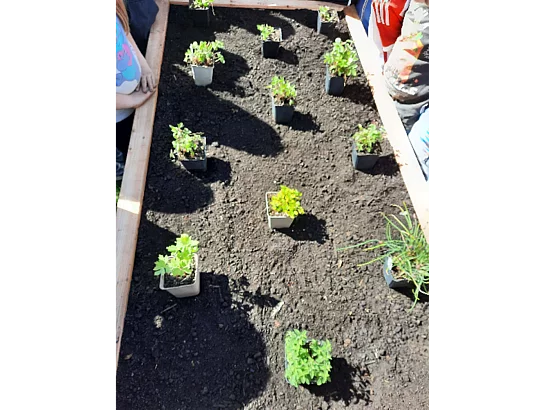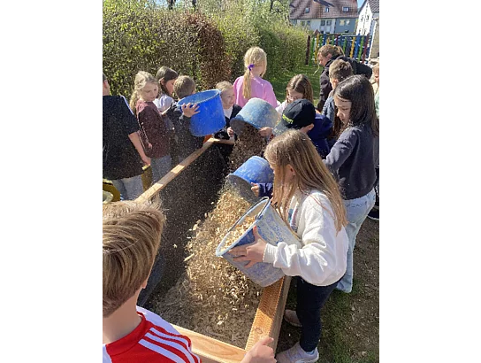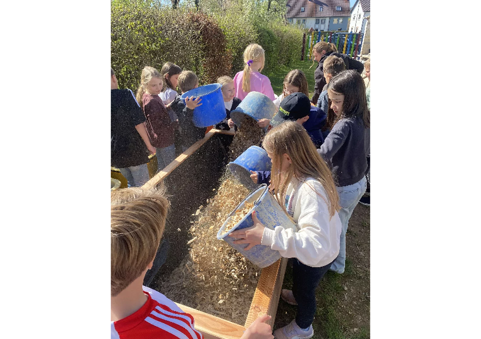 Unsere Schulkinder durften unter Anleitung der Profis das Hochbeet befüllen und bepflanzen.