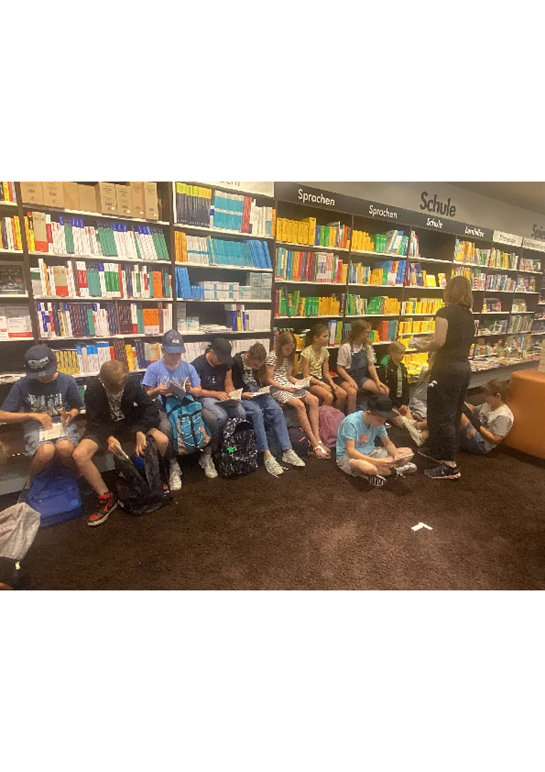 Am Freitag, 04.07.25 lösten die Viertklässler mit ihren Lehrerinnen die Buchgutscheine der Aktion "Ich schenk dir eine Geschichte" zum Welttag des Buches am 23.04.25 ein.