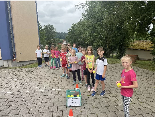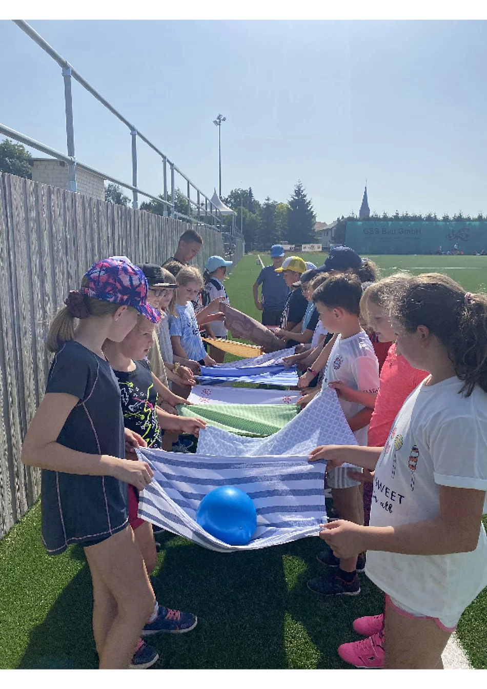 Nach dem Aufwärmen bewiesen die Klassen, dass sich Zusammenhalt lohnt und stellten Geschick beim Tuchball, Zielwerfen, Hindernislauf über Bananenkisten oder Golf unter Beweis.